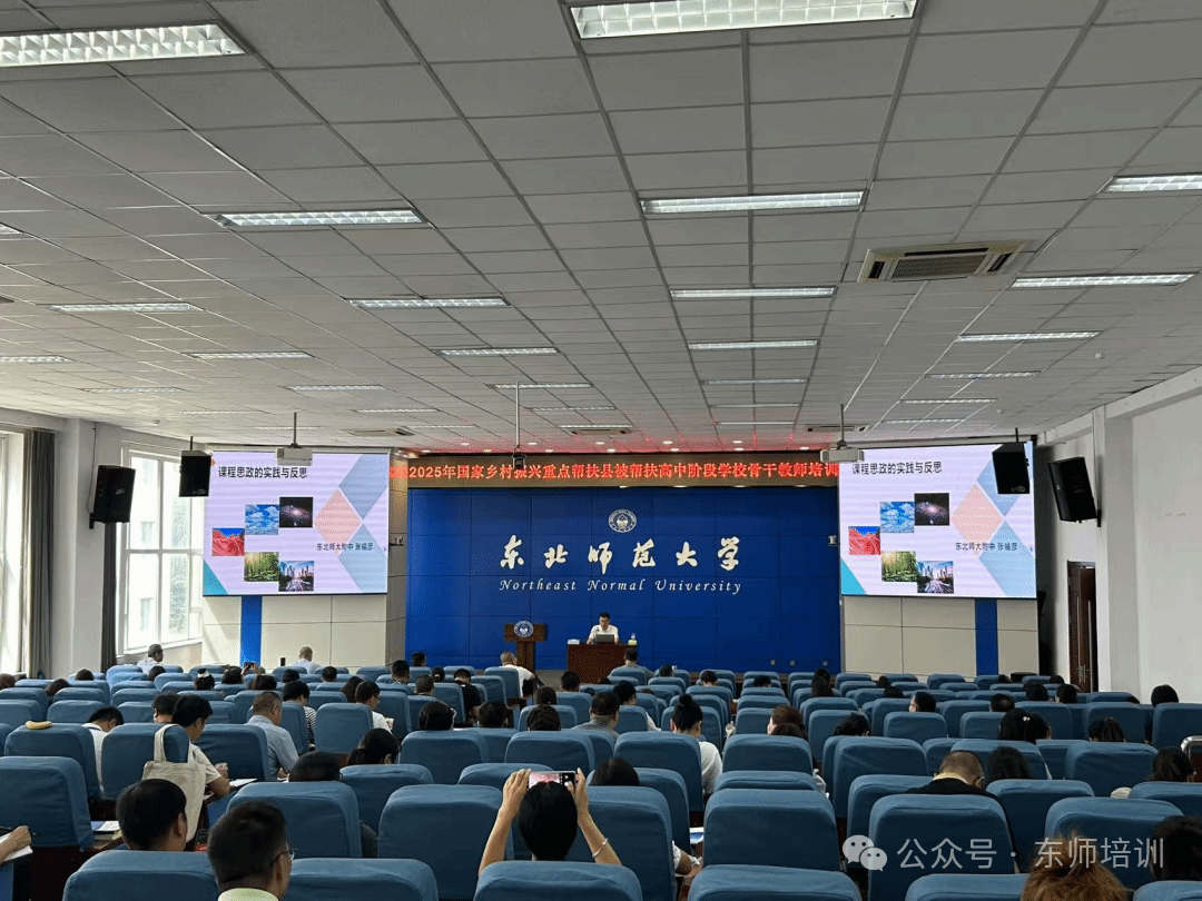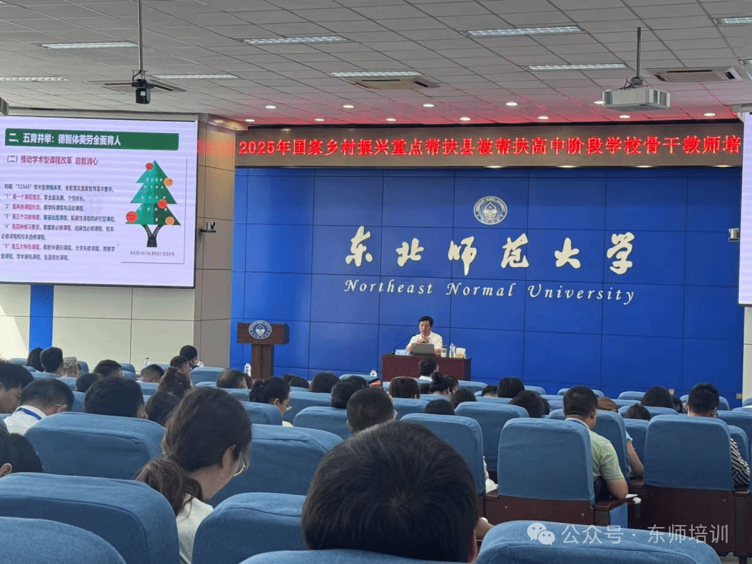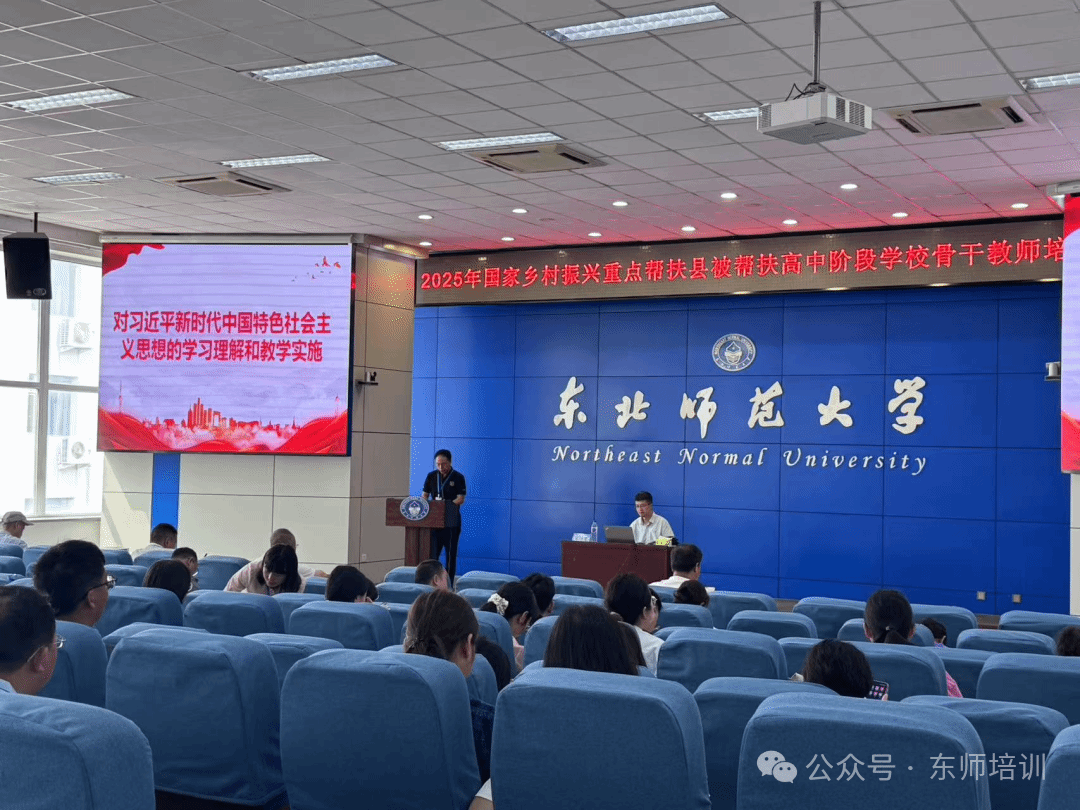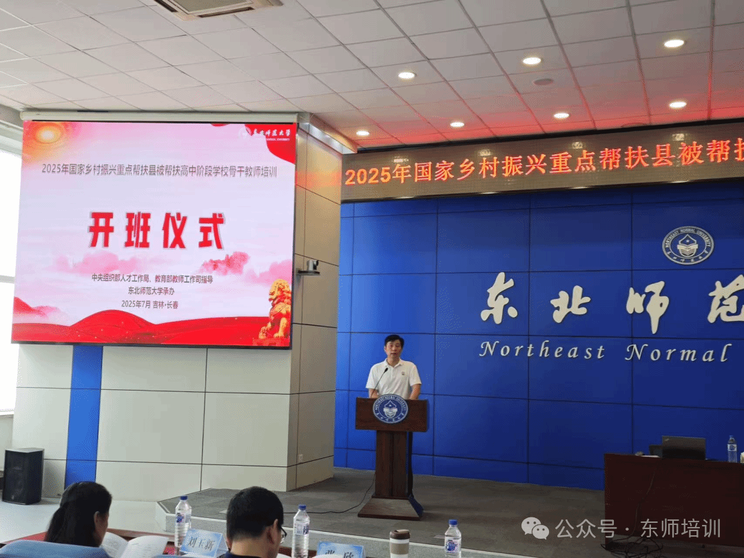2025年7月28日上午,在东北师范大学就业指导中心三楼报告厅隆重举行2025年国家乡村振兴重点帮扶县被帮扶县高中阶段学校思政骨干教师培训开班仪式。东北师范大学校长助理、教育合作与管理处处长,东北师范大学附属中学校长邵志豪出席开班仪式并讲话,东北师范大学教育合作与管理处副处长张欣、东北师范大学附属中学高中部副校长刘玉新出席开班仪式,开班仪式由东北师范大学教师发展学院院长陈欣主持。本次培训活动由中央组织部人才工作局指导、教育部教师工作司主办、东北师范大学承办、东北师范大学教师发展学院与东北师范大学附属中学协办。参加培训活动的来自陕西省、甘肃省、青海省、云南省、贵州省、四川省、重庆市、广西壮族自治区、内蒙古自治区、宁夏回族自治区十省市自治区的百余位教师。
